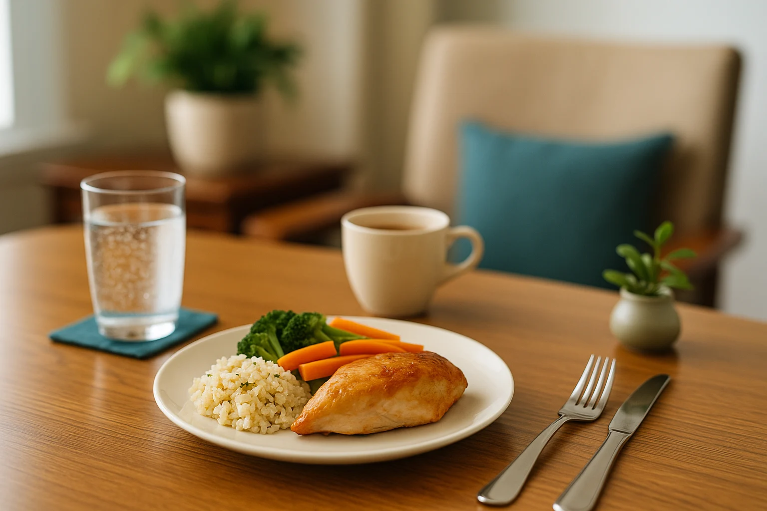 Three balanced meals daily plus snacks, with menus designed to meet personal and medical dietary needs.