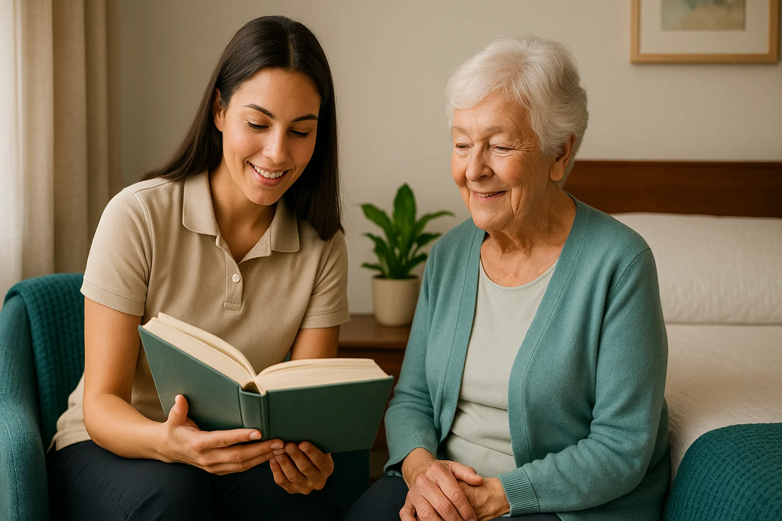 For quieter preferences or recovery days: reading aloud, puzzles, escorted walks, phone/letter writing, life-story conversations, and sensory kits.